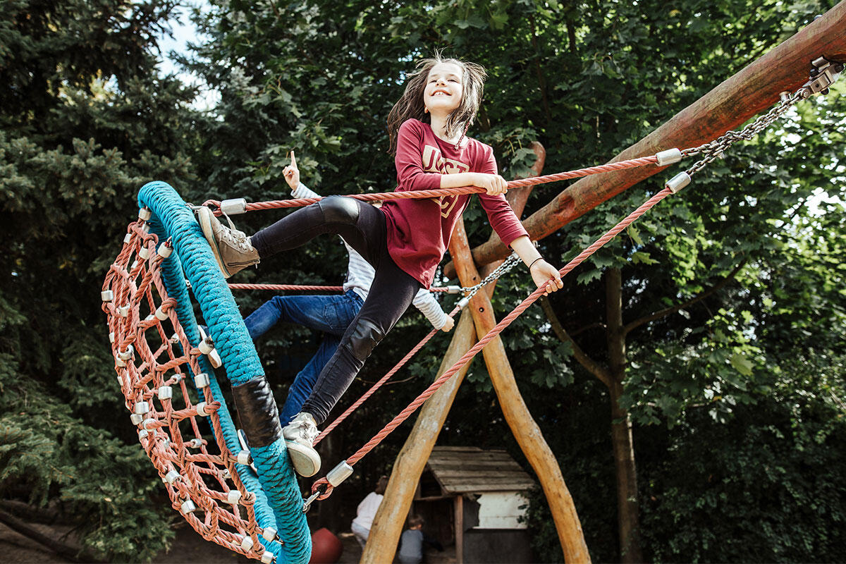 Auf unserem Außengelände rund um unser schönes „Baum“-Haus können die Kinder ihre Geschicklichkeit an der Kletterwand erproben, viele Bewegungselemente, den Bolzplatz und die Tischtennisplatte nutzen oder am Lagerfeuerplatz und auf dem Bauspielplatz aktiv werden.